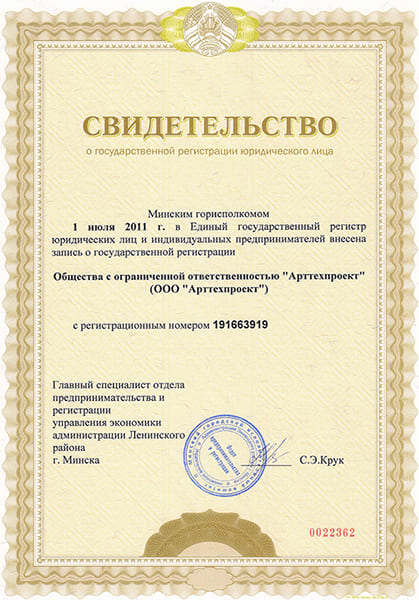 Регистрационный орган: Мингорисполком. Дата регистрации компании: 01.07.2011